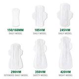 Product matrix: meet the needs of the entire cycle - 150/160/185mm daily model: suitable for non-menstrual use - 245mm daily model: suitable for light menstrual flow/end of menstrual period - 290mm extended daily model: all-weather universal - 350mm safety model: provides special protection for days with heavy menstrual flow - 420mm night model: extended tail to help you sleep all night |